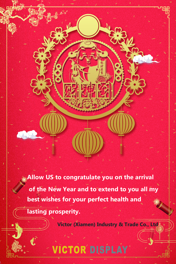 The biggest holiday Spring festival will Coming soon. Victor Display Wish all of our customers a happy holiday. Allow US to congratulate you on the arrival of the New Year and to extend to you all my best wishes for your perfect health and lasting prosperity.