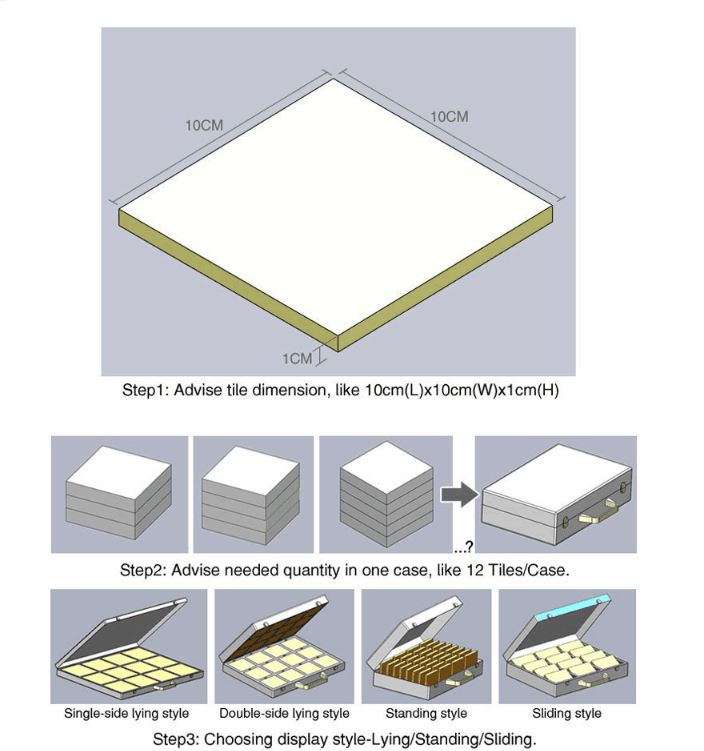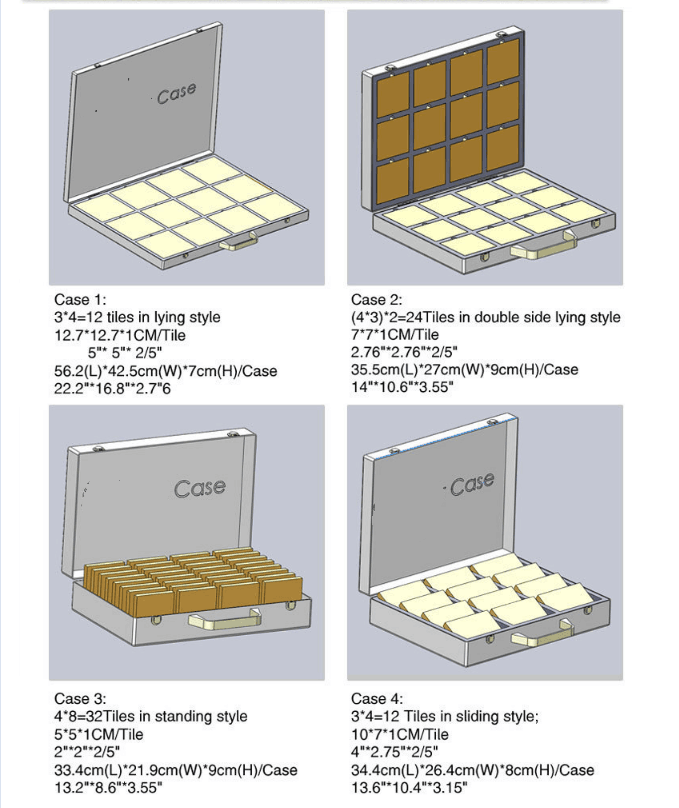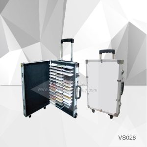 The sample carry case is made of aluminum sheet with MDF panel inside. LOGO can be print on the out surface. Color be silver, brown or black. Surface also can be fake leather. For getting price. you will need advise sample chips dimension, sample chips quantity and choose the layout.