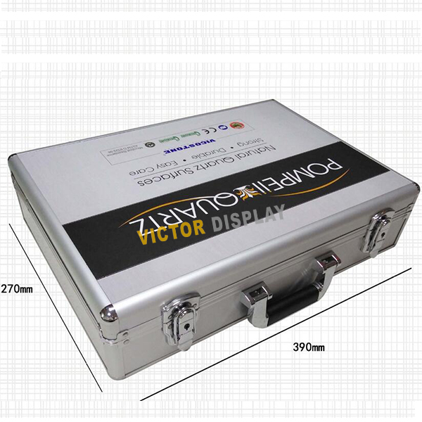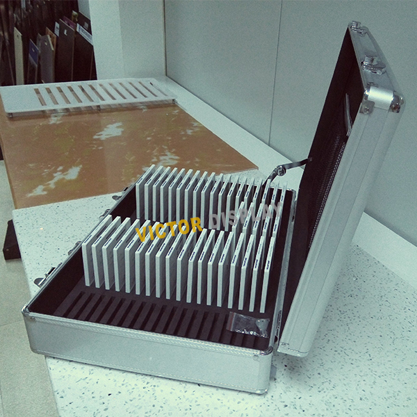 VS037 Aluminum Stone Sample Case made of MDF covered with Aluminum sheet. The Inside EVA foam will keep your granite, marble, quartz stone or tile samples in position. This kind of sample case is easy carrying. Your LOGO can be print on the surface.Customize accept.Victor Display Design and produce stone sample books, stone sample folder, tile sample binders for stone and tile samples.