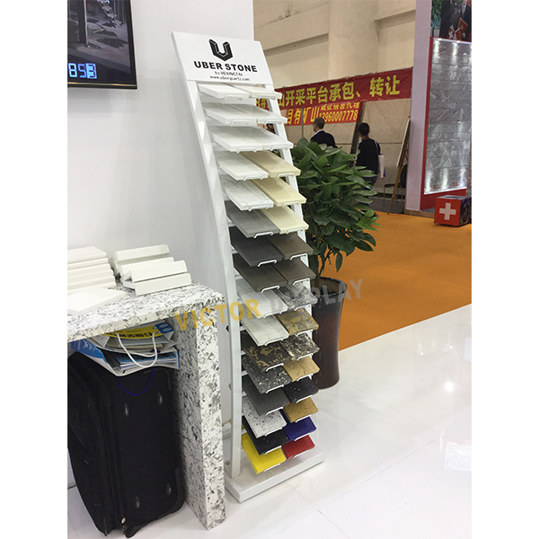 VQ102-Granite Sample Display Racks is the most popular display rack for granite,marble,quartz stone and tile samples. Suit for 24-40 colors quartz stone, marble or granite samples in Showroom. It also can r display be 12 MM to 30 MM stone tile samples. Main color is Glossy white and Matt Black. It can with four wheels as request. There are three parts of this tower display, Base, Bottom body, Upper body. All three parts will packing in one cartons for saving delivery cost.