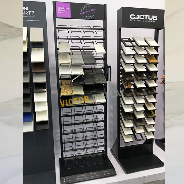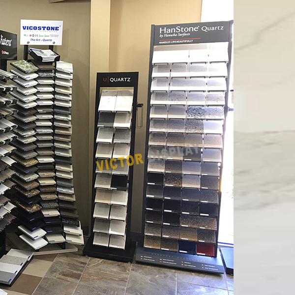 made of 1*2″ metal tube and 1.5 MM thickness metal sheet. Present your quartz stone, granite, marble stone samples on this excellent stone display tower in distributor’s showroom. Victor Display devoted to stone and tile display tools over years, offer variety styles of stone display stand, granite sample display,marble display rack,tile sample box and stone sample binders. We provide excellent quality products with reasonable price, satisfied service and on time delivery.