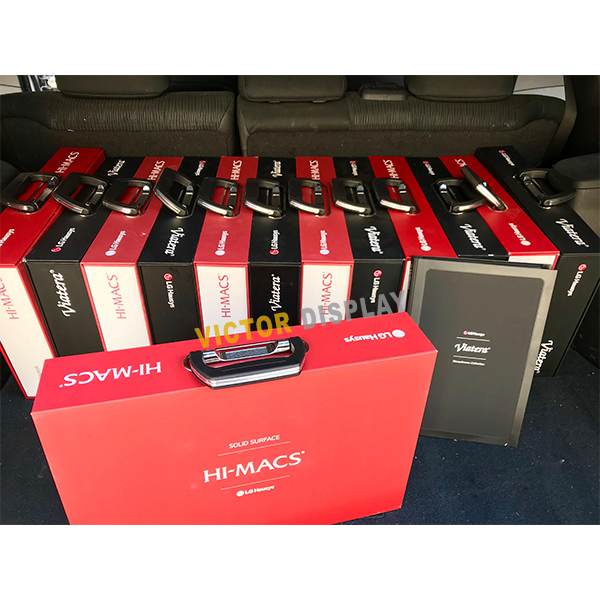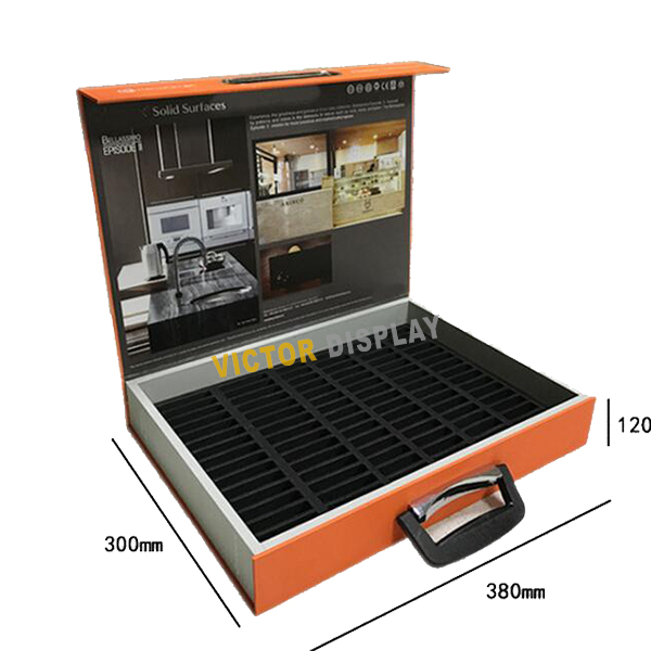 This VS017 Sample Box for Solid Surface Chips is made of MDF, features high quality steel hardware, and holds up to 80- 2” X 2” samples. Solid surface samples are held firmly by die-cut foam. The outside paper cover using a combination of 4-colour offset printing. The sample case is portable by the moving handle. Economic and excellent display method for solid surface.