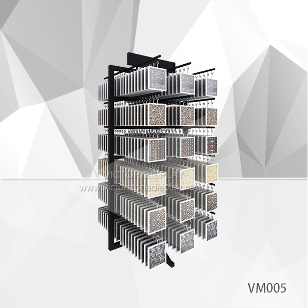 VM005 Mosaic Tile Display for mosaics tiles in showroom. Rotating metal display stand for mosaic tile with display border.Victor Display is the leading Tile Showroom Display Racks manufactures loaded in Xiamen, China. Sample boards also can be supplied.LOGO can be print on the top panel. Quality powder coated surface. Production time is about 30 days. One unit one carton packing, pallet packing can be supply as request.