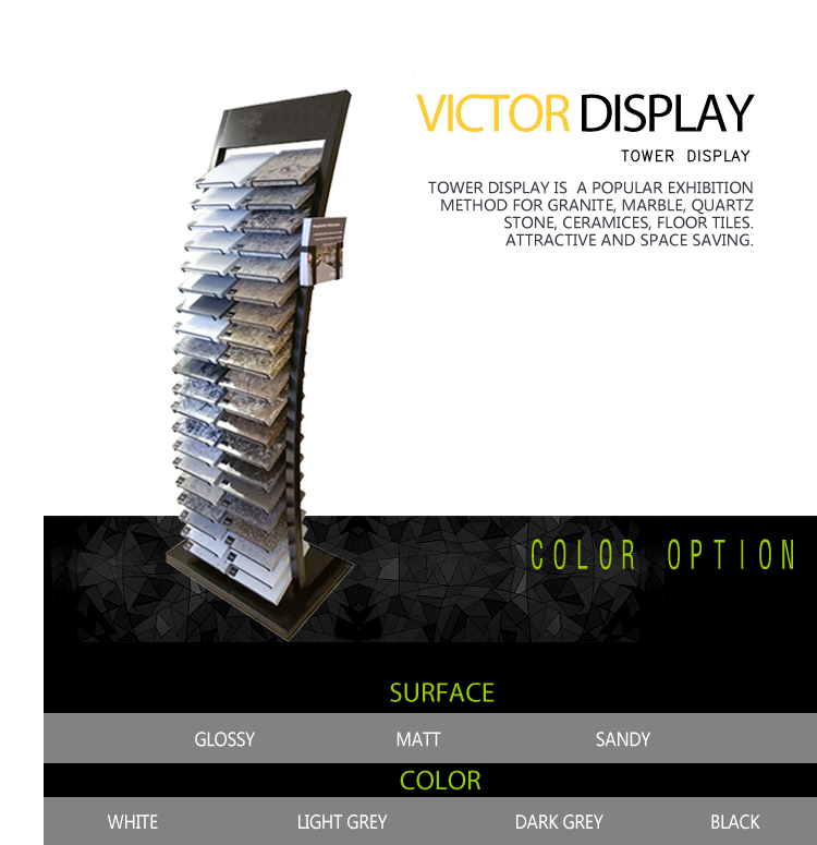 VQ101 Stone Display Tower of all metal structure can hold up to 40 colors granite, marble or quartz stone samples. LOGO can be print on the top panel. Quality powder coated surface. Production time is about 30 days. One unit one carton packing, pallet packing can be supply as request. Victor Display provide different material and custom size Stone Display Rack for Solid Surface Samples, Quartz Stone Sample , Granite and Marble Samples.