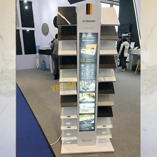 VQ104 Stone Display Rack made of metal sheet printed with white color. LOGO can be printed on the panel. There is a Plexiglas sheet printed with your company information. Inside with an LED light. This stand can be packing each part assembly.