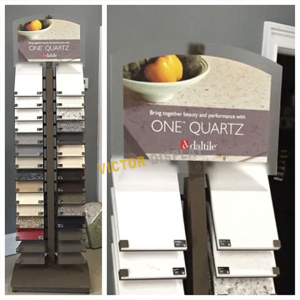 VQ109 Loose Stone Display features removable trays hold up to 40 colors 6*12″ granite, marble or quartz stone samples. Quality products with powder coated surface. It also can redesign to suit any size of granite or marble stone samples. Victor Display Supply quartz stone, granite , marble , mosaic tile display stand, display showcase, display books and so on. For more information or more designs please contact our customer service.