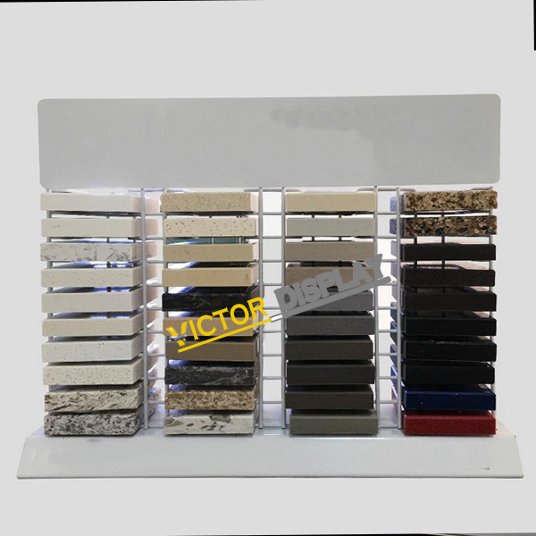 VQ116 Granite Sample Display is made of metal sheet and wires dia 5 mm. The base and top panel can print your company LOGO or website. white powder coated surface. it can holding 40 colors 4*4″ granite, marble, quartz stone or tiles samples in your showroom. This table top granite sample display is loved by colorquartz. We have provide thousands of this metal sample display for colorquartz. Check with our website for other design display stand.