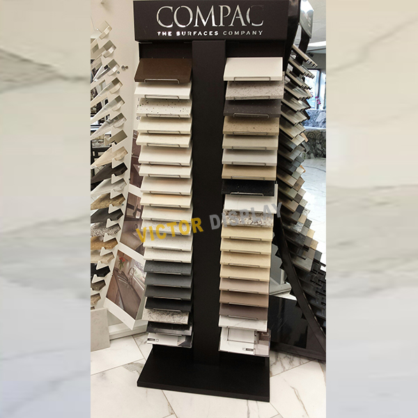 VQ183 Solid surface sample display tower is made of metal tube and wire structure. Suit for 6*12″ stone samples. Two rows will hold up to 40 colors. LOGO can be print on the top panel. Victor Display provide different material and custom size Stone Display Rack for Solid Surface Samples, Quartz Stone Sample , Granite and Marble Samples.