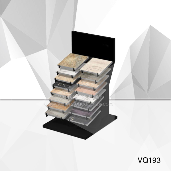 VQ193 Table top Granite Display made of metal structure holding 18 pcs granite, marble or quartz stone samples in showroom. LOGO can be print on top panel. Color can be white, black or grey color. Victor Display provide different material and custom size Stone Display Rack for Solid Surface Samples, Quartz Stone Sample , Granite and Marble Samples.Check with our website for other design display stand.