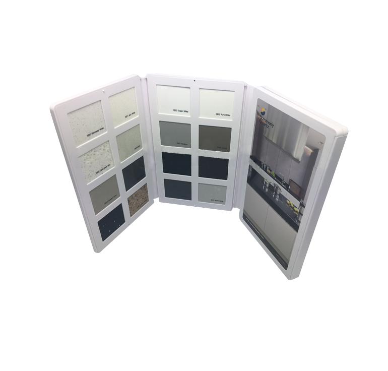 VR402 Engineered Stone Sample Books made of plastic material with round corner. This sample books have four panels for quartz stone sample size 60*70*5 MM or 60*155*5 MM. Total can display 24 pcs samples.Victor Display provide different material and custom size Stone Display Rack for Solid Surface Samples, Quartz Stone Sample , Granite and Marble Samples.We are display tool vendor’s of Geoluxe, hanstone, tce stone, COLORQUARTZ, montgranite, the tile shop, and so on. Need more information please contact our sales team.