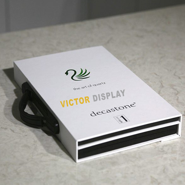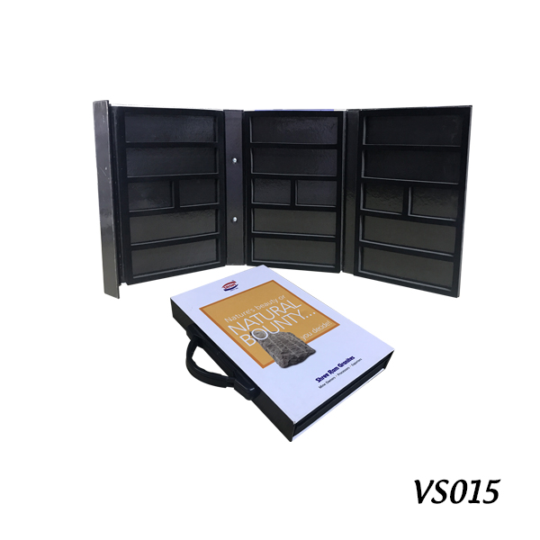 VS015 Quartz Stone Sample Display Folders made of 4mm cardboard sheet covered with 8 mm die cut EVA foam for granite, marble or stone samples. This display method can hold up to 40 pcs 50*70*5 MM quartz surface samples. Laminated covered printed paper showing the company information. Customize accept.