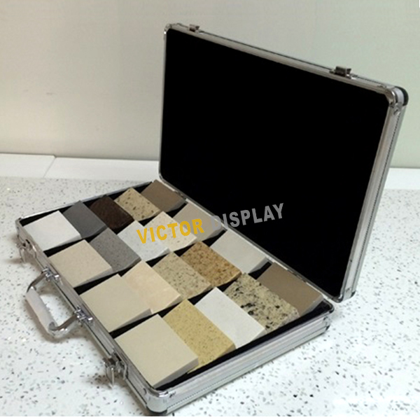 VS031 Quartz Stone Sample Case,it is made of Aluminum material , present quartz stone samples inclined. this display method can hold up to 25 pcs 60*90*15 MM quartz surface samples. Sample can be easy get out for close looking. There is a pcs pf papercard on the top of the case. Company information can be print on it. Customized accept.