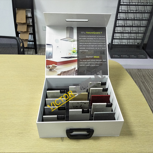 The Sample carry case come in is a great way to extend a brand and add value to the presentation. VS038 Sample Box For Quartz Stone is made of paper covered boards with 4 color offset printing in matt or glossy surface. Inside with die-cut foam for present stone and tile samples in the upright position. Magnetic closing flap with two invisible rounded magnets. For such a heavy product to sample, these sturdy boxes all come complete with a secure closure and handle for carrying like a briefcase!