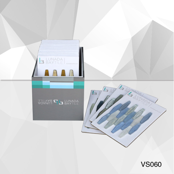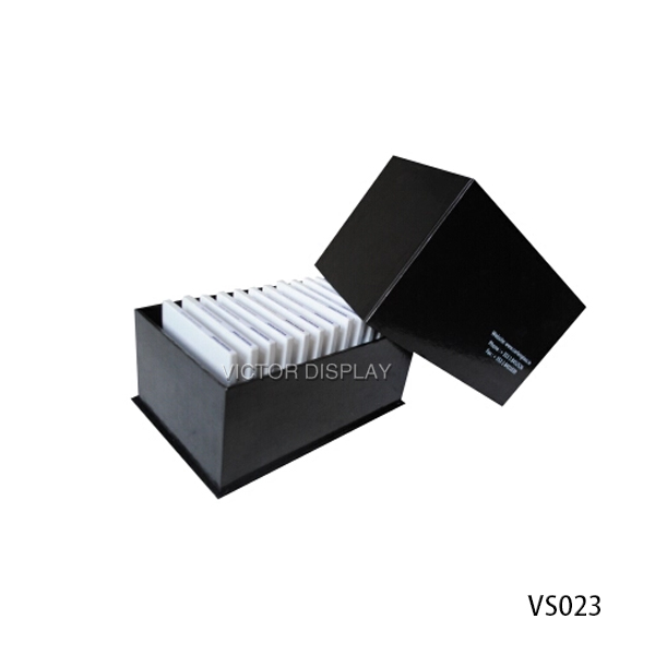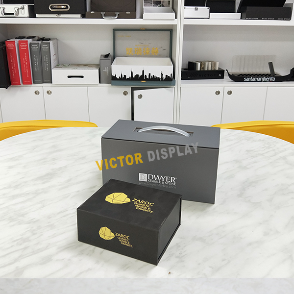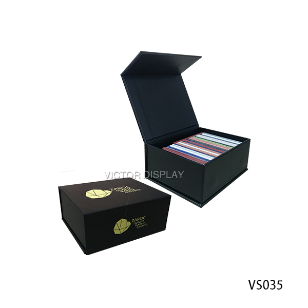 VS056 Stone tile sample cases is made of paper covered boards with 4 color offset printing in matte or glossy surface. Inside with die-cut foam for present stone and tile samples in the upright position. Magnetic closing flap with two invisible rounded magnets. The sample boxes can be customized. Material can be MDF also. for price please email us and advise detail request.