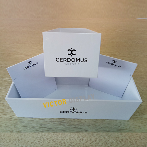VS063 Stone Tile Sample Display Kit is made of paper covered boards with 4 color offset printing in matte or glossy surface. Inside with die-cut foam for present stone and tile samples in the upright position. Magnetic closing flap with two invisible rounded magnets. The sample boxes can be customized. Material can be MDF also. for price please email us and advise detail request.