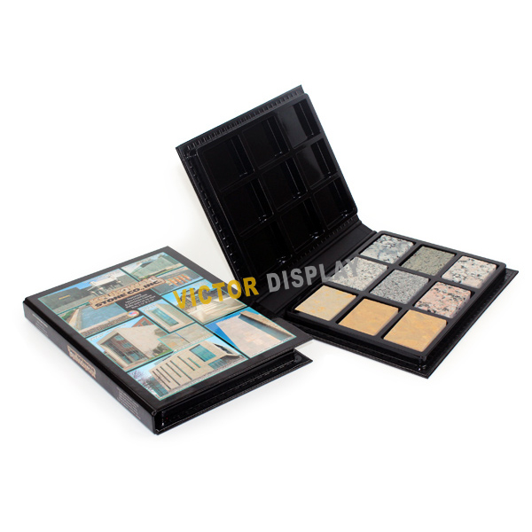 VS109 Stone Display Folder , Stone Sample Folder made of 4mm cardboard sheet covered for granite, marble or stone samples. This display method can hold up Marble, Granite, Quartz surface, Tile, Mosaic tile samples. Laminated covered printed paper showing the company information. Customize accept.Victor Display Design and produce stone sample books, stone sample folder, tile sample binders for stone and tile samples.For more detail please Contact our sales person.